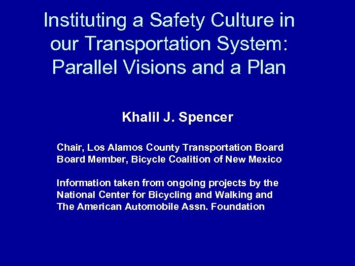 Instituting a Safety Culture in our Transportation System: Parallel Visions and a Plan Khalil J. Spencer Chair, Los Alamos County Transportation Board Member, Bicycle Coalition of New Mexico Information taken from ongoing projects by the National Center for Bicycling and Walking and The American Automobile Assn. Foundation