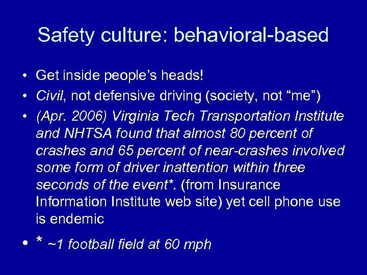 Safety culture: behavioral-based • Get inside people’s heads! • Civil, not defensive driving (society, not “me”) • (Apr. 2006) Virginia Tech Transportation Institute and NHTSA found that almost 80 percent of crashes and 65 percent of near-crashes involved some form of driver inattention within three seconds of the event*. (from Insurance Information Institute web site) yet cell phone use is endemic • * ~1 football field at 60 mph
