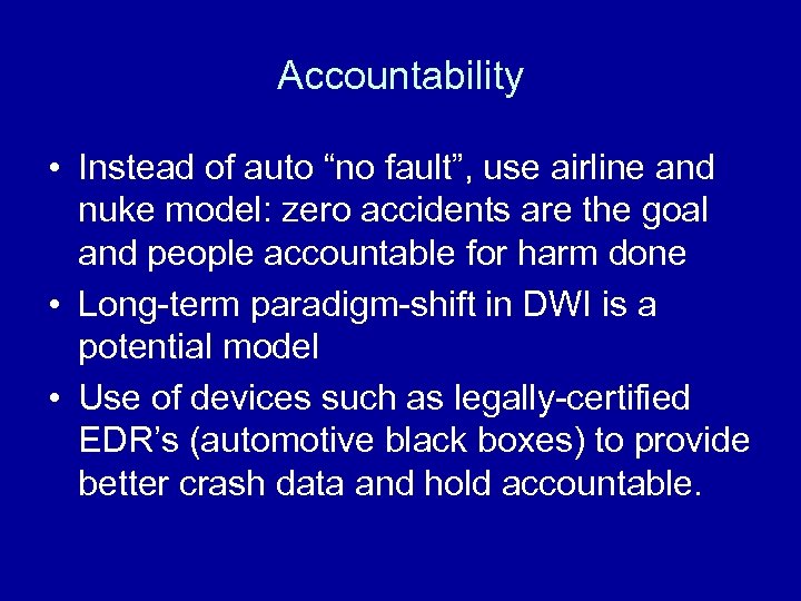 Accountability • Instead of auto “no fault”, use airline and nuke model: zero accidents are the goal and people accountable for harm done • Long-term paradigm-shift in DWI is a potential model • Use of devices such as legally-certified EDR’s (automotive black boxes) to provide better crash data and hold accountable.
