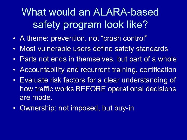What would an ALARA-based safety program look like? • • • A theme: prevention, not “crash control” Most vulnerable users define safety standards Parts not ends in themselves, but part of a whole Accountability and recurrent training, certification Evaluate risk factors for a clear understanding of how traffic works BEFORE operational decisions are made. • Ownership: not imposed, but buy-in