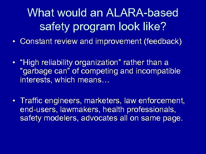 What would an ALARA-based safety program look like? • Constant review and improvement (feedback) • “High reliability organization” rather than a “garbage can” of competing and incompatible interests, which means… • Traffic engineers, marketers, law enforcement, end-users, lawmakers, health professionals, safety modelers, advocates all on same page.
