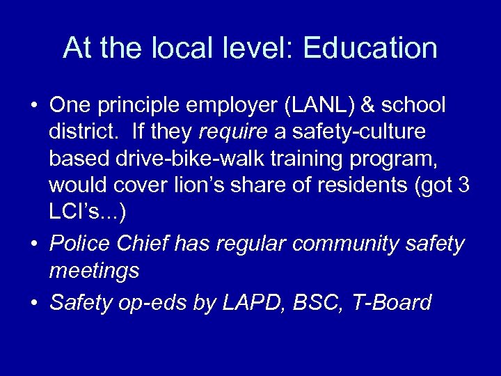 At the local level: Education • One principle employer (LANL) & school district. If they require a safety-culture based drive-bike-walk training program, would cover lion’s share of residents (got 3 LCI’s. . . ) • Police Chief has regular community safety meetings • Safety op-eds by LAPD, BSC, T-Board