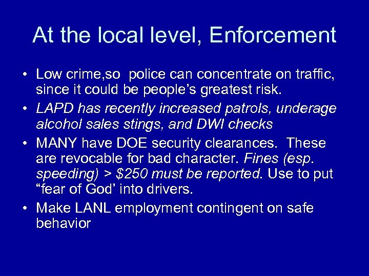 At the local level, Enforcement • Low crime, so police can concentrate on traffic, since it could be people’s greatest risk. • LAPD has recently increased patrols, underage alcohol sales stings, and DWI checks • MANY have DOE security clearances. These are revocable for bad character. Fines (esp. speeding) > $250 must be reported. Use to put “fear of God’ into drivers. • Make LANL employment contingent on safe behavior