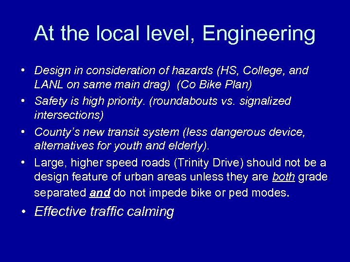 At the local level, Engineering • Design in consideration of hazards (HS, College, and LANL on same main drag) (Co Bike Plan) • Safety is high priority. (roundabouts vs. signalized intersections) • County’s new transit system (less dangerous device, alternatives for youth and elderly). • Large, higher speed roads (Trinity Drive) should not be a design feature of urban areas unless they are both grade separated and do not impede bike or ped modes. • Effective traffic calming