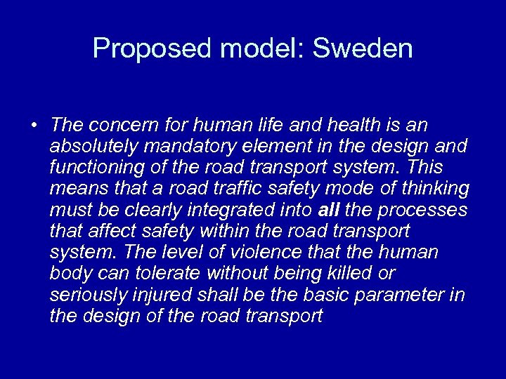 Proposed model: Sweden • The concern for human life and health is an absolutely mandatory element in the design and functioning of the road transport system. This means that a road traffic safety mode of thinking must be clearly integrated into all the processes that affect safety within the road transport system. The level of violence that the human body can tolerate without being killed or seriously injured shall be the basic parameter in the design of the road transport