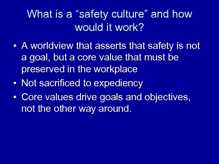 What is a “safety culture” and how would it work? • A worldview that asserts that safety is not a goal, but a core value that must be preserved in the workplace • Not sacrificed to expediency • Core values drive goals and objectives, not the other way around.