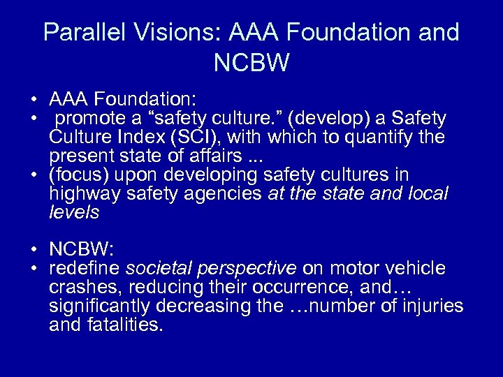 Parallel Visions: AAA Foundation and NCBW • AAA Foundation: • promote a “safety culture. ” (develop) a Safety Culture Index (SCI), with which to quantify the present state of affairs. . . • (focus) upon developing safety cultures in highway safety agencies at the state and local levels • NCBW: • redefine societal perspective on motor vehicle crashes, reducing their occurrence, and… significantly decreasing the …number of injuries and fatalities.