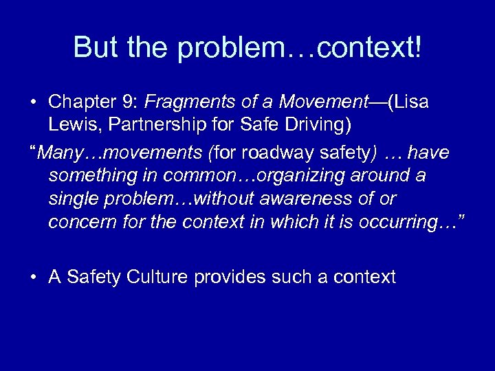 But the problem…context! • Chapter 9: Fragments of a Movement—(Lisa Lewis, Partnership for Safe Driving) “Many…movements (for roadway safety) … have something in common…organizing around a single problem…without awareness of or concern for the context in which it is occurring…” • A Safety Culture provides such a context