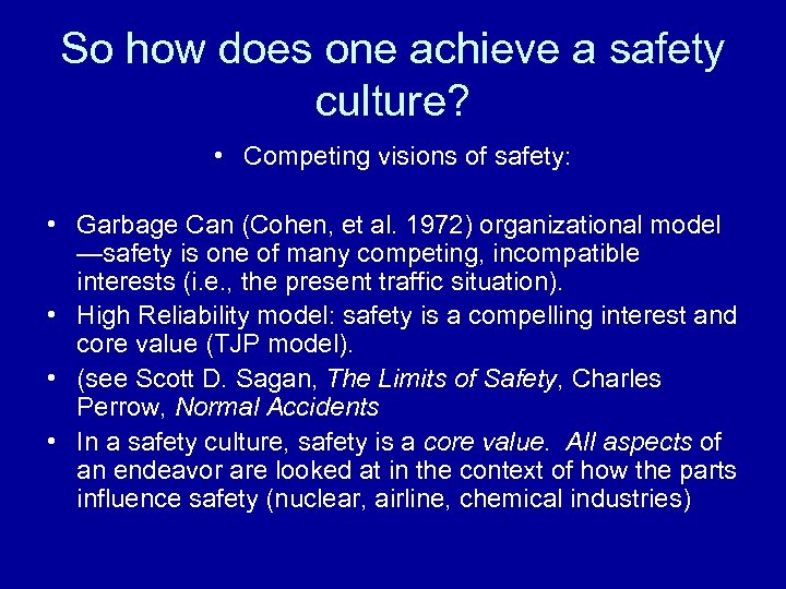 So how does one achieve a safety culture? • Competing visions of safety: • Garbage Can (Cohen, et al. 1972) organizational model —safety is one of many competing, incompatible interests (i. e. , the present traffic situation). • High Reliability model: safety is a compelling interest and core value (TJP model). • (see Scott D. Sagan, The Limits of Safety, Charles Perrow, Normal Accidents • In a safety culture, safety is a core value. All aspects of an endeavor are looked at in the context of how the parts influence safety (nuclear, airline, chemical industries)