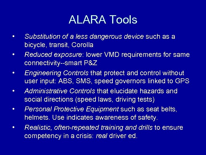 ALARA Tools • • • Substitution of a less dangerous device such as a bicycle, transit, Corolla Reduced exposure: lower VMD requirements for same connectivity--smart P&Z Engineering Controls that protect and control without user input: ABS, SMS, speed governors linked to GPS Administrative Controls that elucidate hazards and social directions (speed laws, driving tests) Personal Protective Equipment such as seat belts, helmets. Use indicates awareness of safety. Realistic, often-repeated training and drills to ensure competency in a crisis: real driver ed.