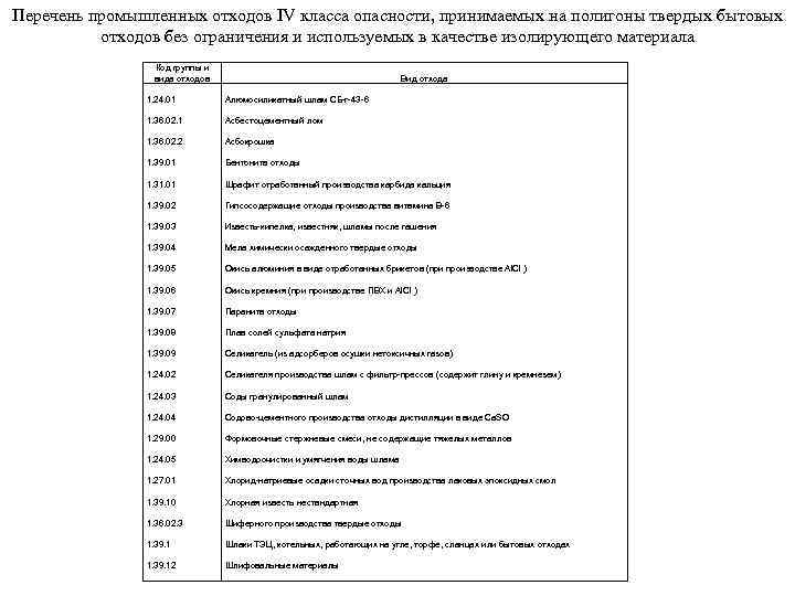 Перечень промышленных отходов IV класса опасности, принимаемых на полигоны твердых бытовых отходов без ограничения и используемых в качестве изолирующего материала Код группы и вида отходов Вид отхода 1. 24. 01 Алюмосиликатный шлам СБ-г-43 -6 1. 36. 02. 1 Асбестоцементный лом 1. 36. 02. 2 Асбокрошка 1. 39. 01 Бентонита отходы 1. 31. 01 Шрафит отработанный производства карбида кальция 1. 39. 02 Гипсосодержащие отходы производства витамина В-6 1. 39. 03 Известь-кипелка, известняк, шламы после гашения 1. 39. 04 Мела химически осажденного твердые отходы 1. 39. 05 Окись алюминия в виде отработанных брикетов (при производстве Аl. Сl ) 1. 39. 06 Окись кремния (при производстве ПВХ и Аl. Сl ) 1. 39. 07 Паранита отходы 1. 39. 08 Плав солей сульфата натрия 1. 39. 09 Селикагель (из адсорберов осушки нетоксичных газов) 1. 24. 02 Селикагеля производства шлам с фильтр-прессов (содержит глину и кремнезем) 1. 24. 03 Соды гранулированный шлам 1. 24. 04 Содово-цементного производства отходы дистилляции в виде Са. SO 1. 29. 00 Формовочные стержневые смеси, не содержащие тяжелых металлов 1. 24. 05 Химводоочистки и умягчения воды шлама 1. 27. 01 Хлорид-натриевые осадки сточных вод производства лаковых эпоксидных смол 1. 39. 10 Хлорная известь нестандартная 1. 36. 02. 3 Шиферного производства твердые отходы 1. 39. 1 Шлаки ТЭЦ, котельных, работающих на угле, торфе, сланцах или бытовых отходах 1. 39. 12 Шлифовальные материалы
