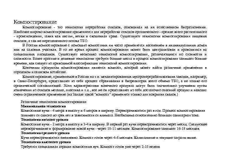 Компостирование - это технология переработки отходов, основанная на их естественном биоразложении. Наиболее широко компостирование применяется для переработки отходов органического - прежде всего растительного - происхождения, таких как листья, ветки и скошенная трава. Существуют технологии компостирования пищевых отходов, а так же неразделенного потока ТБО. В России компостирование с помощью компостных ям часто применяется населением в индивидуальных домах или на садовых участках. В то же время процесс компостирования может быть централизован и проводиться на специальных площадках. Существует несколько технологий компостирования, различающихся по стоимости и сложности. Более простые и дешевые технологии требуют больше места и процесс компостирования занимает больше времени, как следует из приводимой классификации технологий компостирования. Конечным продуктом компостирования является компост, который может найти различные применения в городском и сельском хозяйстве. Компостирование, применяемое в России на т. н. механизированных мусороперерабатывающих заводах, например, в Санкт-Петербурге, представляет из себя процесс сбраживания в биореакторах всего объема ТБО, а не только его органической составляющей. Хотя характеристики конечного продукта могут быть значительно улучшены путем извлечения из отходов металла, пластика и т. д. , все же он представляет из себя достаточно опасный продукт и находит очень ограниченное применение (на Западе такой "компост" применяют только для покрытия свалок. ) Различные технологии компостирования Минимальная технология Компостные кучи - 4 метра в высоту и 6 метров в ширину. Переворачиваются раз в год. Процесс компостирования занимает от одного до трех лет в зависимости от климата. Необходима относительно большая санитарная зона. Технология низкого уровня Компостные кучи - 2 метра в высоту и 3 -4 в ширину. В первый раз кучи переворачиваются через месяц. Следующее переворачивание и формирование новой кучи - через 10 -11 месяцев. Компостирование занимает 16 -18 месяцев. Технология среднего уровня Кучи переворачиваются ежедневно. Компост готов через 4 -6 месяцев. Капитальные и текущие затраты выше. Технология высокого уровня Требуется специальная аэрация компостных куч. Компост готов уже через 2 -10 недель