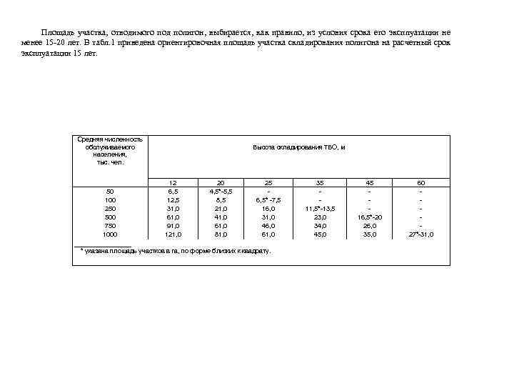 Площадь участка, отводимого под полигон, выбирается, как правило, из условия срока его эксплуатации не менее 15 -20 лет. В табл. 1 приведена ориентировочная площадь участка складирования полигона на расчетный срок эксплуатации 15 лет. Средняя численность обслуживаемого населения, тыс. чел. Высота складирования ТБО, м 12 20 25 50 6, 5 4, 5*-5, 5 100 12, 5 8, 5 6, 5* -7, 5 250 31, 0 21, 0 16, 0 500 61, 0 41, 0 31, 0 750 91, 0 61, 0 46, 0 1000 121, 0 81, 0 61, 0 ________ * указана площадь участков в га, по форме близких к квадрату. 35 11, 5*-13, 5 23, 0 34, 0 45 16, 5*-20 26, 0 35, 0 60 27*-31, 0