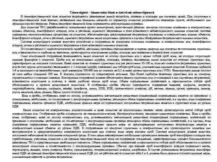 Caнитарно - защитная зона и система мониторинга В санитарно-защитной зоне полигона запрещается размещение жилой застройки, скважин и колодцев для питьевых целей. При отсутствии в санитарно-защитной зоне зеленых насаждений или земляных насыпей по периметру полигона устраиваются кавальеры грунта, необходимого для изоляции при его закрытии. Режим санитарно-защитной зоны определяется действующими нормами. Для полигона ТБО разрабатывается специальный проект мониторинга, включающий разделы: контроль состояния подземных и поверхностных водных объектов, атмосферного воздуха, почв и растений, шумового загрязнения в зоне возможного неблагоприятного влияния полигона; система управления технологическими процессами на полигоне, обеспечивающая предотвращение загрязнения подземных и поверхностных водных объектов, атмосферного воздуха, почв и растений, шумового загрязнения выше допустимых пределов в случаях обнаружения загрязняющего влияния полигонов. Система мониторинга должна включать устройства и сооружения за контролем состояния подземных и поверхностных вод, атмосферного воздуха, почвы и растений и шумового загрязнения в зоне возможного влияния полигона. По согласованию с гидрогеологической службой, местными органами санэпиднадзора и охраны природы для контроля за состоянием грунтовых вод, в зависимости от глубины их залегания, проектируются контрольные шурфы, колодцы или скважины в зеленой зоне полигона. Одно контрольное сооружение закладывается выше полигона по потоку грунтовых вод с целью отбора проб воды, на которую отсутствует влияние фильтрата с полигона. Пробы вод из контрольных шурфов, колодцев, скважин, заложенных выше полигона по течению грунтовых вод, характеризуют их исходное состояние. Ниже полигона по течению грунтовых вод (на расстоянии 50 -100 м, если нет опасности загрязнения грунтовых вод за счет других источников) закладывают 1 -2 колодца (шурфа, скважины) для отбора проб воды, учитывающих влияние полигона. Колодцы глубиной 2 -6 м выполняют из железобетонных труб диаметром 700 -900 мм до отметки на 0, 2 м ниже уровня грунтовых вод (УГВ). Фильтрующее днище состоит из слоя щебня толщиной 200 мм. В колодец спускаются по стационарной лестнице. При более глубоком залегании грунтовых вод их контроль осуществляется с помощью скважин. Конструкция сооружений должна обеспечивать защиту грунтовых вод от попаданий в них случайных загрязнений, возможности водоотлива и откачки, а также удобство взятия проб воды. Объем определяемых показателей и периодичность отбора проб обосновываются в проекте мониторинга полигонов. В отобранных пробах обычно определяется содержание аммиака, нитритов, нитратов, гидрокарбонатов, кальция, хлоридов, железа, сульфатов, лития, ХПК, БПК, органического углерода, р. Н, магния, кадмия, хрома, цианидов, свинца, ртути, мышьяка, меди, кадмия, бария, сухого остатка и др. Если в пробах, отобранных ниже по потоку, устанавливается значительное увеличение концентраций определяемых веществ по сравнению с контрольным, необходимо, по согласованию с контролирующими органами, расширить объем определяемых показателей, а в случаях, если содержание определяемых веществ превысит ПДК, необходимо принять меры по ограничению поступления загрязняющих веществ в грунтовые воды до уровня ПДК. Выше полигона на 