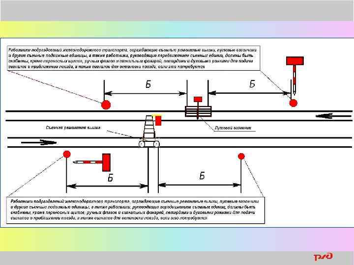 Порядок организации работы съемных ремонтных вышек на таких участках, обеспечивающий безопасность движения поездов, устанавливается с учетом местных условий владельцем инфраструктуры, владельцем железнодорожных путей необщего пользования. Работники подразделений железнодорожного транспорта, ограждающие съемные ремонтные вышки, путевые вагончики и другие съемные подвижные единицы, а также работники, руководящие передвижением съемных единиц, должны быть снабжены, кроме переносных щитов, ручных флагов и сигнальных фонарей, петардами и духовыми рожками для подачи сигналов о приближении поезда, а также сигналов для остановки поезда, если это потребуется.