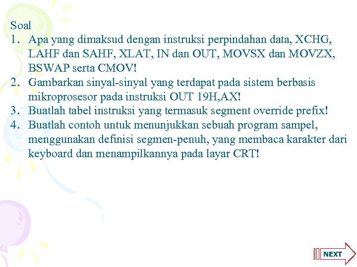 Soal 1. Apa yang dimaksud dengan instruksi perpindahan data, XCHG, LAHF dan SAHF, XLAT, IN dan OUT, MOVSX dan MOVZX, BSWAP serta CMOV! 2. Gambarkan sinyal-sinyal yang terdapat pada sistem berbasis mikroprosesor pada instruksi OUT 19 H, AX! 3. Buatlah tabel instruksi yang termasuk segment override prefix! 4. Buatlah contoh untuk menunjukkan sebuah program sampel, menggunakan definisi segmen-penuh, yang membaca karakter dari keyboard dan menampilkannya pada layar CRT! NEXT