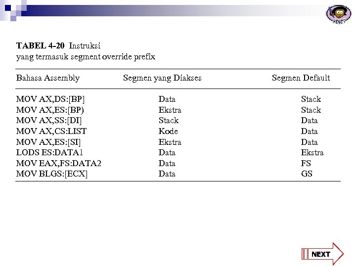 TABEL 4 -20 Instruksi yang termasuk segment override prefix Bahasa Assembly MOV AX, DS: [BP] MOV AX, ES: [BP) MOV AX, SS: [DI] MOV AX, CS: LIST MOV AX, ES: [SI] LODS ES: DATA 1 MOV EAX, FS: DATA 2 MOV BLGS: [ECX] Segmen yang Diakses Data Ekstra Stack Kode Ekstra Data Segmen Default Stack Data Ekstra FS GS NEXT