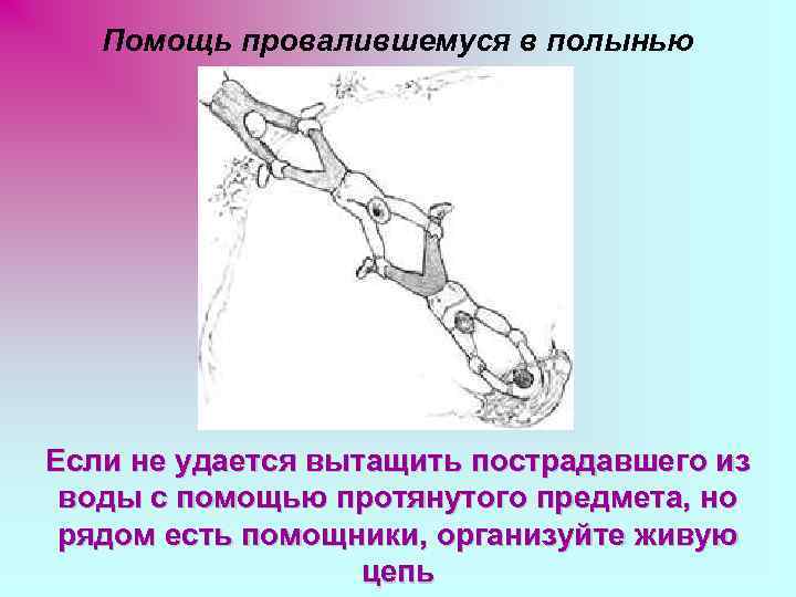 Помощь провалившемуся в полынью Если не удается вытащить пострадавшего из воды с помощью протянутого предмета, но рядом есть помощники, организуйте живую цепь