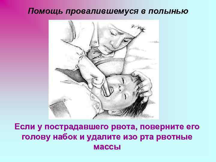Помощь провалившемуся в полынью Если у пострадавшего рвота, поверните его голову набок и удалите изо рта рвотные массы