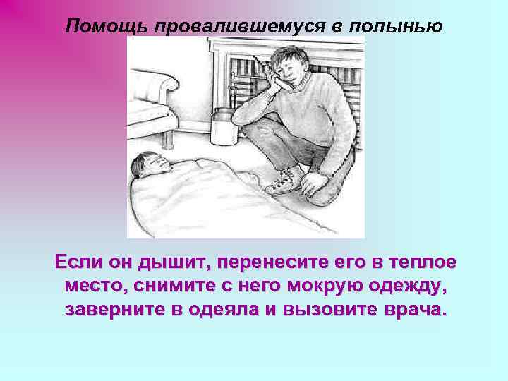Помощь провалившемуся в полынью Если он дышит, перенесите его в теплое место, снимите с него мокрую одежду, заверните в одеяла и вызовите врача.