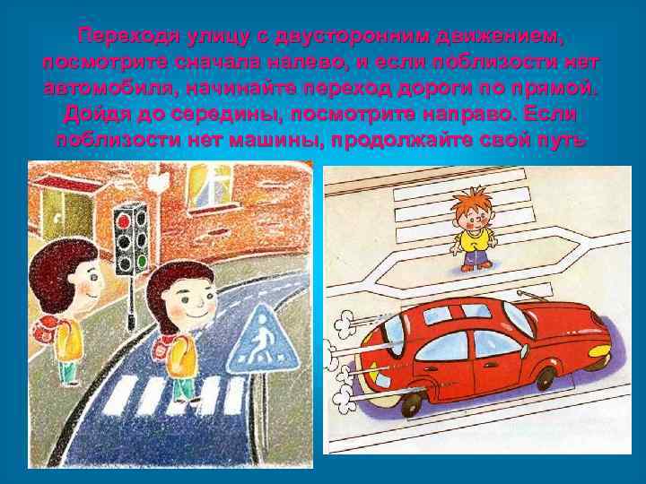 Переходя улицу с двусторонним движением, посмотрите сначала налево, и если поблизости нет автомобиля, начинайте переход дороги по прямой. Дойдя до середины, посмотрите направо. Если поблизости нет машины, продолжайте свой путь
