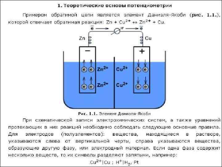 n При потенциометрических измерениях составляют гальванический элемент с индикаторным электродом, потенциал которого зависит от активности хотя бы одного из компонентов электрохимической реакции, и электродом сравнения и измеряют электродвижущую силу (ЭДС) этого элемента.