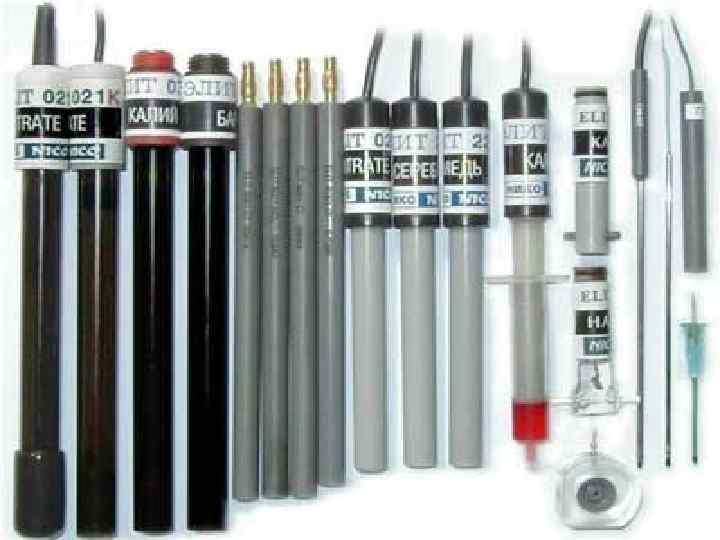 n В качестве индикаторных в потенциометрическом анализе применяют: n 1. Электроды, на поверхности которых протекают реакции с обменом электронов. Их называют электронообменными, или окислительновосстановительными. В качестве таких электродов применяют электроды из химически инертных металлов - платины, золота и др. В аналитической практике находит применение выпускаемый промышленностью точечный платиновый электрод ЭПВ-1 -100 и изготовленный из специального стекла мембранный окислительно-восстановительный электрод ЭО - 1.