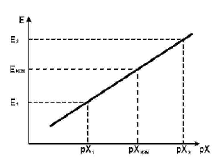 n Метод градуировочного графика. Для этого заранее строят градуировочный график в координатах ЭДС - lg. СИ с использованием стандартных растворов анализируемого иона, имеющих одинаковую ионную силу paствора. n График - линейный. Затем по ионной силе измеряют ЭДС цепи с анализируемым раствором и по графику определяют концентрацию раствора. Пример определения приведен на рис.