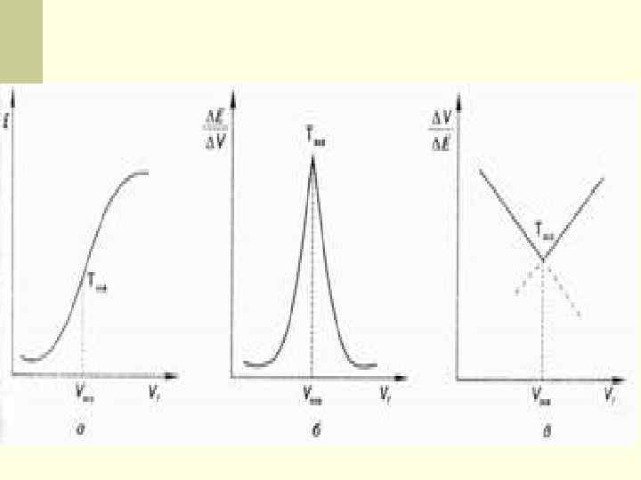 n Интегральная кривая титрования (рис. а) строится в координатах E - VТ. Точка эквивалентности находится в середине скачка титрования. n Дифференциальная кривая титрования (рис. б) строится в координатах: n ∆Е / ∆V- VT. Точка эквивалентности находится в вершине кривой титрования. Дифференциальная кривая титрования дает более точное определение точки эквивалентности, чем интегральная. n Кривая титрования в методе Грана (рис. в) строится в координатах: ∆V / ∆Е -VT. Точка эквивалентности находится на пересечении двух прямых линий. Этой кривой удобно пользоваться для определения точки эквивалентности при титровании разбавленных растворов.