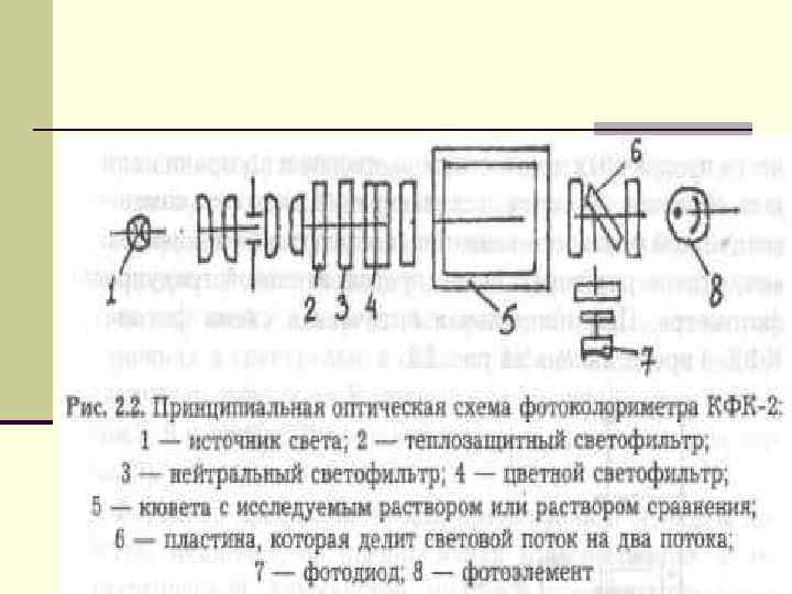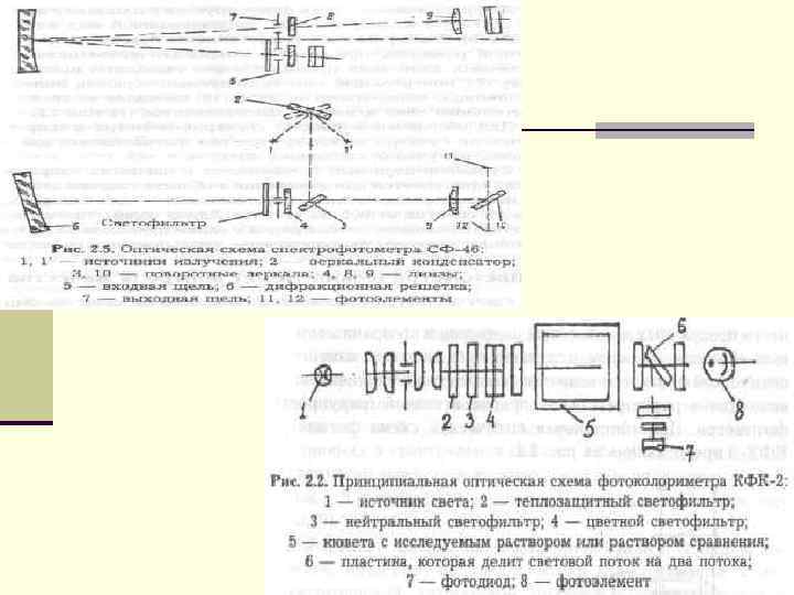 Приборами для фотоколориметрии служат фотоэлектроколориметры (ФЭК), характеризующиеся простотой оптической и электрической схем. Большинство ФЭК имеет набор из 10 -15 светофильтров и представляет собой двухлучевые приборы, в которых пучок света от источника излучения (лампа накаливания, редко ртутная лампа) проходит через светофильтр и делитель светового потока (обычно призму), который делит пучок на два, направляемые через кюветы с исследуемым раствором и с раствором сравнения.