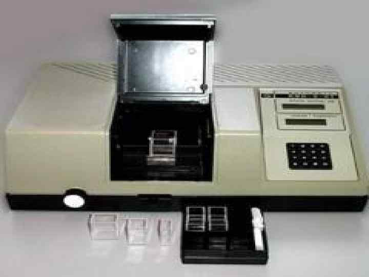 Для измерения поглощательной способности используют спектрофотометры -оптические приборы, состоящие из источника света, камеры для образцов, монохроматора (призма или дифракционная решетка) и детектора. Сигнал от детектора регистрируется в виде непрерывной кривой (спектра поглощения) или в виде таблиц, если спектрофотометр имеет встроенную ЭВМ.