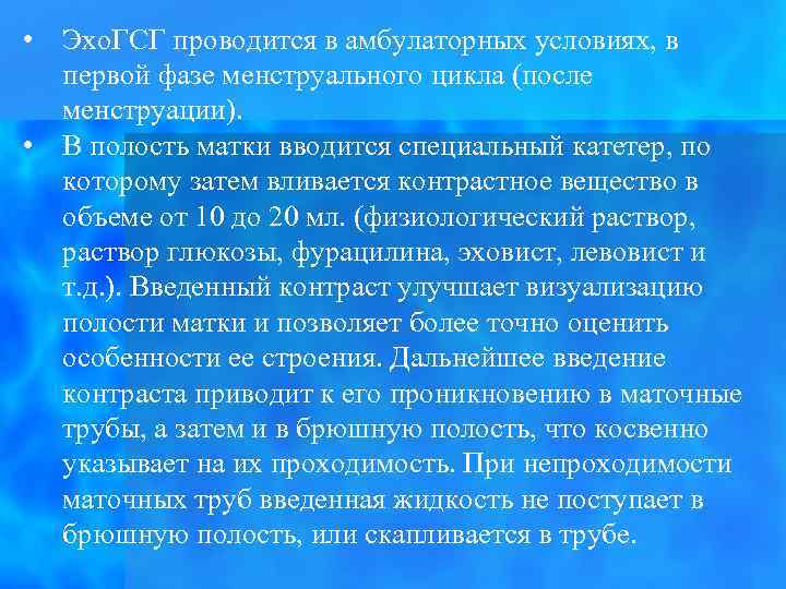 • Эхо. ГСГ проводится в амбулаторных условиях, в первой фазе менструального цикла (после менструации). • В полость матки вводится специальный катетер, по которому затем вливается контрастное вещество в объеме от 10 до 20 мл. (физиологический раствор, раствор глюкозы, фурацилина, эховист, левовист и т. д. ). Введенный контраст улучшает визуализацию полости матки и позволяет более точно оценить особенности ее строения. Дальнейшее введение контраста приводит к его проникновению в маточные трубы, а затем и в брюшную полость, что косвенно указывает на их проходимость. При непроходимости маточных труб введенная жидкость не поступает в брюшную полость, или скапливается в трубе.
