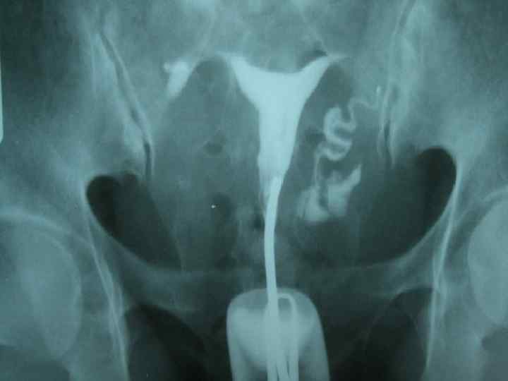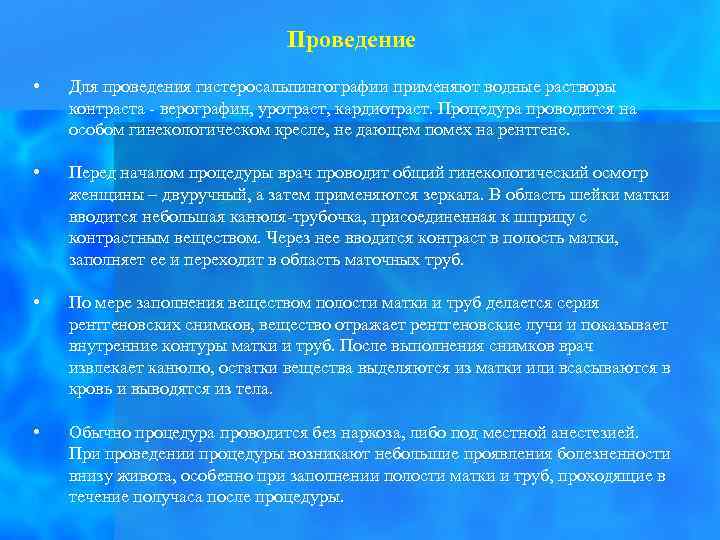 Проведение • Для проведения гистеросальпингографии применяют водные растворы контраста - верографин, уротраст, кардиотраст. Процедура проводится на особом гинекологическом кресле, не дающем помех на рентгене. • Перед началом процедуры врач проводит общий гинекологический осмотр женщины – двуручный, а затем применяются зеркала. В область шейки матки вводится небольшая канюля-трубочка, присоединенная к шприцу с контрастным веществом. Через нее вводится контраст в полость матки, заполняет ее и переходит в область маточных труб. • По мере заполнения веществом полости матки и труб делается серия рентгеновских снимков, вещество отражает рентгеновские лучи и показывает внутренние контуры матки и труб. После выполнения снимков врач извлекает канюлю, остатки вещества выделяются из матки или всасываются в кровь и выводятся из тела. • Обычно процедура проводится без наркоза, либо под местной анестезией. При проведении процедуры возникают небольшие проявления болезненности внизу живота, особенно при заполнении полости матки и труб, проходящие в течение получаса после процедуры.