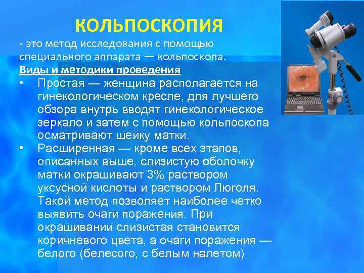 КОЛЬПОСКОПИЯ это метод исследования с помощью специального аппарата — кольпоскопа. Виды и методики проведения • Простая — женщина располагается на гинекологическом кресле, для лучшего обзора внутрь вводят гинекологическое зеркало и затем с помощью кольпоскопа осматривают шейку матки. • Расширенная — кроме всех этапов, описанных выше, слизистую оболочку матки окрашивают 3% раствором уксусной кислоты и раствором Люголя. Такой метод позволяет наиболее четко выявить очаги поражения. При окрашивании слизистая становится коричневого цвета, а очаги поражения — белого (белесого, с белым налетом)