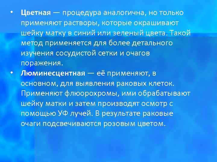 • Цветная — процедура аналогична, но только применяют растворы, которые окрашивают шейку матку в синий или зеленый цвета. Такой метод применяется для более детального изучения сосудистой сетки и очагов поражения. • Люминесцентная — её применяют, в основном, для выявления раковых клеток. Применяют флюорохромы, ими обрабатывают шейку матки и затем производят осмотр с помощью УФ лучей. В результате раковые очаги подсвечиваются розовым цветом.
