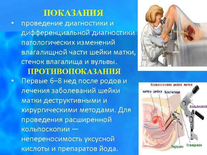ПОКАЗАНИЯ • проведение диагностики и дифференциальной диагностики патологических изменений влагалищной части шейки матки, стенок влагалища и вульвы. ПРОТИВОПОКАЗАНИЯ • Первые 6– 8 нед после родов и лечения заболеваний шейки матки деструктивными и хирургическими методами. Для проведения расширенной кольпоскопии — непереносимость уксусной кислоты и препаратов йода.