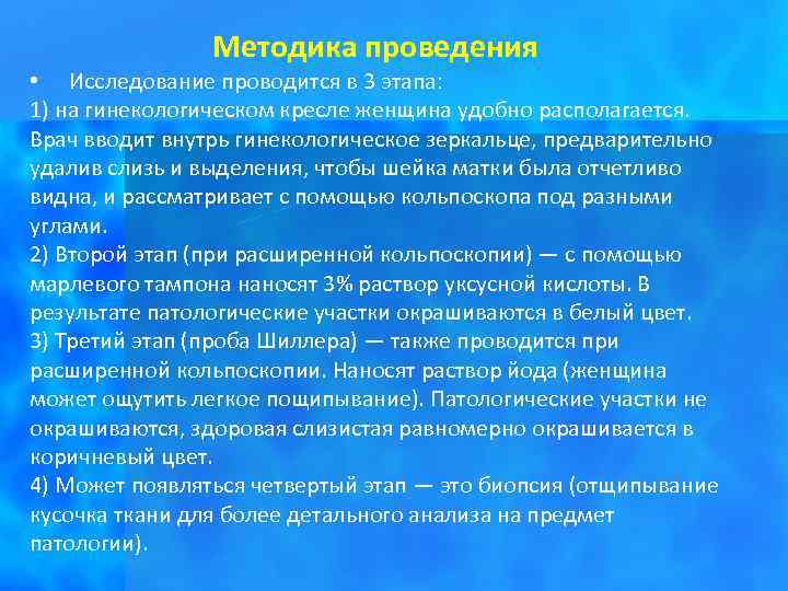 Методика проведения • Исследование проводится в 3 этапа: 1) на гинекологическом кресле женщина удобно располагается. Врач вводит внутрь гинекологическое зеркальце, предварительно удалив слизь и выделения, чтобы шейка матки была отчетливо видна, и рассматривает с помощью кольпоскопа под разными углами. 2) Второй этап (при расширенной кольпоскопии) — с помощью марлевого тампона наносят 3% раствор уксусной кислоты. В результате патологические участки окрашиваются в белый цвет. 3) Третий этап (проба Шиллера) — также проводится при расширенной кольпоскопии. Наносят раствор йода (женщина может ощутить легкое пощипывание). Патологические участки не окрашиваются, здоровая слизистая равномерно окрашивается в коричневый цвет. 4) Может появляться четвертый этап — это биопсия (отщипывание кусочка ткани для более детального анализа на предмет патологии).