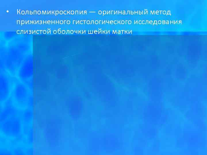 • Кольпомикроскопия — оригинальный метод прижизненного гистологического исследования слизистой оболочки шейки матки