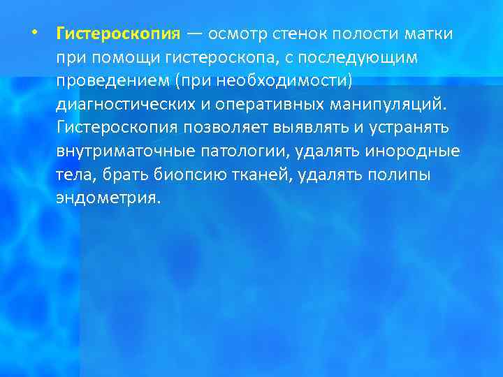 • Гистероскопия — осмотр стенок полости матки при помощи гистероскопа, с последующим проведением (при необходимости) диагностических и оперативных манипуляций. Гистероскопия позволяет выявлять и устранять внутриматочные патологии, удалять инородные тела, брать биопсию тканей, удалять полипы эндометрия.