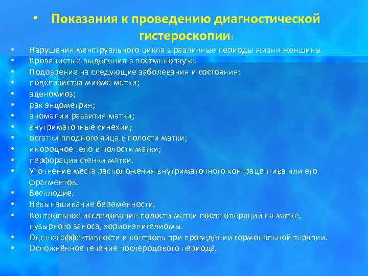 • • • • • Показания к проведению диагностической гистероскопии: Нарушения менструального цикла в различные периоды жизни женщины. Кровянистые выделения в постменопаузе. Подозрение на следующие заболевания и состояния: подслизистая миома матки; аденомиоз; рак эндометрия; аномалии развития матки; внутриматочные синехии; остатки плодного яйца в полости матки; инородное тело в полости матки; перфорация стенки матки. Уточнение места расположения внутриматочного контрацептива или его фрагментов. Бесплодие. Невынашивание беременности. Контрольное исследование полости матки после операций на матке, пузырного заноса, хорионэпителиомы. Оценка эффективности и контроль при проведении гормональной терапии. Осложнённое течение послеродового периода.