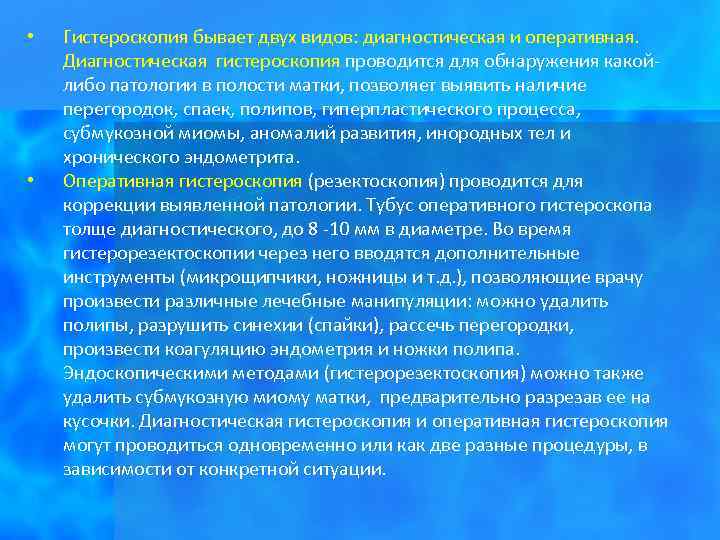 • • Гистероскопия бывает двух видов: диагностическая и оперативная. Диагностическая гистероскопия проводится для обнаружения какой либо патологии в полости матки, позволяет выявить наличие перегородок, спаек, полипов, гиперпластического процесса, субмукозной миомы, аномалий развития, инородных тел и хронического эндометрита. Оперативная гистероскопия (резектоскопия) проводится для коррекции выявленной патологии. Тубус оперативного гистероскопа толще диагностического, до 8 10 мм в диаметре. Во время гистерорезектоскопии через него вводятся дополнительные инструменты (микрощипчики, ножницы и т. д. ), позволяющие врачу произвести различные лечебные манипуляции: можно удалить полипы, разрушить синехии (спайки), рассечь перегородки, произвести коагуляцию эндометрия и ножки полипа. Эндоскопическими методами (гистерорезектоскопия) можно также удалить субмукозную миому матки, предварительно разрезав ее на кусочки. Диагностическая гистероскопия и оперативная гистероскопия могут проводиться одновременно или как две разные процедуры, в зависимости от конкретной ситуации.