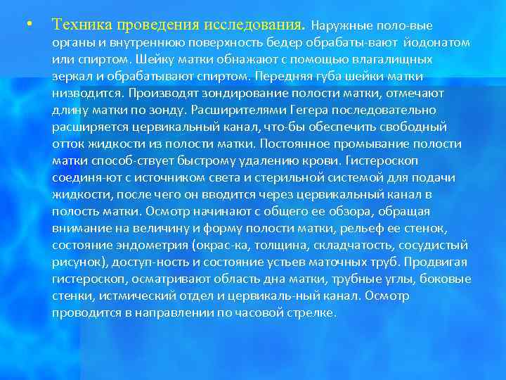 • Техника проведения исследования. Наружные поло вые органы и внутреннюю поверхность бедер обрабаты вают йодонатом или спиртом. Шейку матки обнажают с помощью влагалищных зеркал и обрабатывают спиртом. Передняя губа шейки матки низводится. Производят зондирование полости матки, отмечают длину матки по зонду. Расширителями Гегера последовательно расширяется цервикальный канал, что бы обеспечить свободный отток жидкости из полости матки. Постоянное промывание полости матки способ ствует быстрому удалению крови. Гистероскоп соединя ют с источником света и стерильной системой для подачи жидкости, после чего он вводится через цервикальный канал в полость матки. Осмотр начинают с общего ее обзора, обращая внимание на величину и форму полости матки, рельеф ее стенок, состояние эндометрия (окрас ка, толщина, складчатость, сосудистый рисунок), доступ ность и состояние устьев маточных труб. Продвигая гистероскоп, осматривают область дна матки, трубные углы, боковые стенки, истмический отдел и цервикаль ный канал. Осмотр проводится в направлении по часовой стрелке.