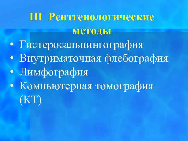 • • III Рентгенологические методы Гистеросальпингография Внутриматочная флебография Лимфография Компьютерная томография (КТ)