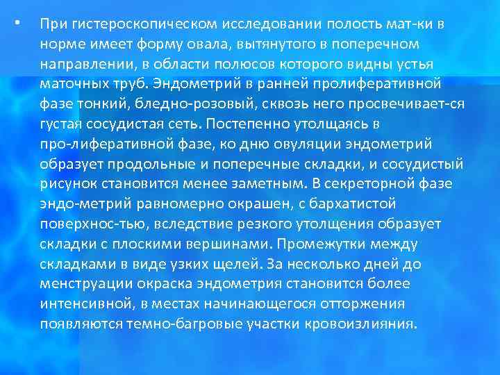 • При гистероскопическом исследовании полость мат ки в норме имеет форму овала, вытянутого в поперечном направлении, в области полюсов которого видны устья маточных труб. Эндометрий в ранней пролиферативной фазе тонкий, бледно розовый, сквозь него просвечивает ся густая сосудистая сеть. Постепенно утолщаясь в про лиферативной фазе, ко дню овуляции эндометрий образует продольные и поперечные складки, и сосудистый рисунок становится менее заметным. В секреторной фазе эндо метрий равномерно окрашен, с бархатистой поверхнос тью, вследствие резкого утолщения образует складки с плоскими вершинами. Промежутки между складками в виде узких щелей. За несколько дней до менструации окраска эндометрия становится более интенсивной, в местах начинающегося отторжения появляются темно багровые участки кровоизлияния.