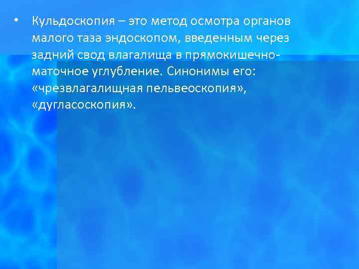 • Кульдоскопия – это метод осмотра органов малого таза эндоскопом, введенным через задний свод влагалища в прямокишечно маточное углубление. Синонимы его: «чрезвлагалищная пельвеоскопия» , «дугласоскопия» .
