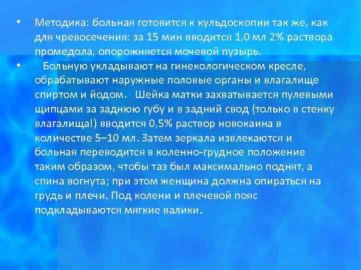 • • Методика: больная готовится к кульдоскопии так же, как для чревосечения: за 15 мин вводится 1, 0 мл 2% раствора промедола, опорожняется мочевой пузырь. Больную укладывают на гинекологическом кресле, обрабатывают наружные половые органы и влагалище спиртом и йодом. Шейка матки захватывается пулевыми щипцами за заднюю губу и в задний свод (только в стенку влагалища!) вводится 0, 5% раствор новокаина в количестве 5– 10 мл. Затем зеркала извлекаются и больная переводится в коленно грудное положение таким образом, чтобы таз был максимально поднят, а спина вогнута; при этом женщина должна опираться на грудь и плечи. Под колени и плечевой пояс подкладываются мягкие валики.