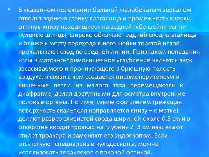 • В указанном положении больной желобоватым зеркалом отводят заднюю стенку влагалища и промежность кверху; оттянув книзу находящиеся на задней губе шейки матки пулевые щипцы, широко обнажают задний свод влагалища и ближе к месту перехода в него шейки толстой иглой прокалывают свод по средней линии. Признаком попадания иглы в маточно прямокишечное углубление является звук засасываемого и проникающего в брюшную полость воздуха, в связи с чем создается пневмоперитонеум и кишечные петли из малого таза перемещаются к диафрагме, делая доступными для осмотра внутренние половые органы. По игле, узким скальпелем (режущая поверхность скальпеля направляется книзу – к матке) делают разрез слизистой свода шириной около 0, 5 см и в отверстие вводят троакар на глубину 2– 3 см извлекают стилет троакара и заменяют его эндоскопом. Если отсутствуют специальные кульдоскопы, можно использовать торакоскоп с боковой оптикой.
