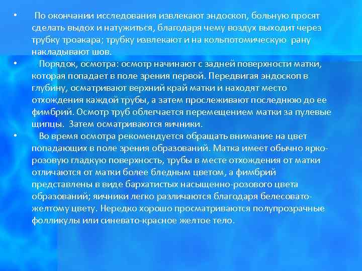 • • • По окончании исследования извлекают эндоскоп, больную просят сделать выдох и натужиться, благодаря чему воздух выходит через трубку троакара; трубку извлекают и на кольпотомическую рану накладывают шов. Порядок, осмотра: осмотр начинают с задней поверхности матки, которая попадает в поле зрения первой. Передвигая эндоскоп в глубину, осматривают верхний край матки и находят место отхождения каждой трубы, а затем прослеживают последнюю до ее фимбрий. Осмотр труб облегчается перемещением матки за пулевые щипцы. Затем осматриваются яичники. Во время осмотра рекомендуется обращать внимание на цвет попадающих в поле зрения образований. Матка имеет обычно ярко розовую гладкую поверхность, трубы в месте отхождения от матки отличаются от матки более бледным цветом, а фимбрий представлены в виде бархатистых насыщенно розового цвета образований; яичники легко различаются благодаря белесовато желтому цвету. Нередко хорошо просматриваются полупрозрачные фолликулы или синевато красное желтое тело.