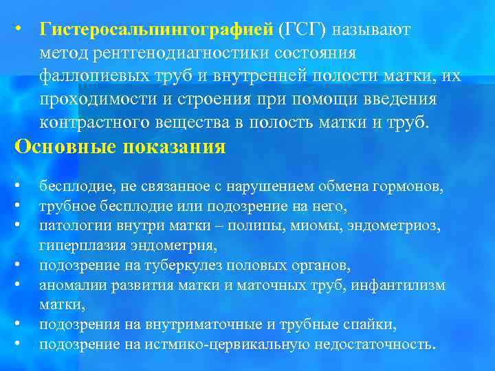 • Гистеросальпингографией (ГСГ) называют метод рентгенодиагностики состояния фаллопиевых труб и внутренней полости матки, их проходимости и строения при помощи введения контрастного вещества в полость матки и труб. Основные показания • • бесплодие, не связанное с нарушением обмена гормонов, трубное бесплодие или подозрение на него, патологии внутри матки – полипы, миомы, эндометриоз, гиперплазия эндометрия, подозрение на туберкулез половых органов, аномалии развития матки и маточных труб, инфантилизм матки, подозрения на внутриматочные и трубные спайки, подозрение на истмико-цервикальную недостаточность.