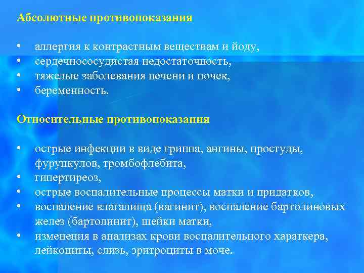 Абсолютные противопоказания • • аллергия к контрастным веществам и йоду, сердечнососудистая недостаточность, тяжелые заболевания печени и почек, беременность. Относительные противопоказания • • • острые инфекции в виде гриппа, ангины, простуды, фурункулов, тромбофлебита, гипертиреоз, острые воспалительные процессы матки и придатков, воспаление влагалища (вагинит), воспаление бартолиновых желез (бартолинит), шейки матки, изменения в анализах крови воспалительного хараткера, лейкоциты, слизь, эритроциты в моче.